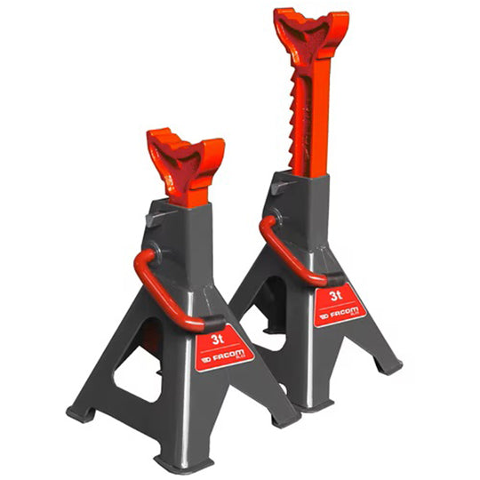 Capacité de charge : 3 t.||Chandelles avec crémaillère et goupilles de verrouillage.||9 réglages de hauteur de 285 à 430 mm.||Épingle enchaînée au stand.||Construction fiable et robuste||Base de 4 pieds avec plaques soudées pour une stabilité et une rigidité accrues.