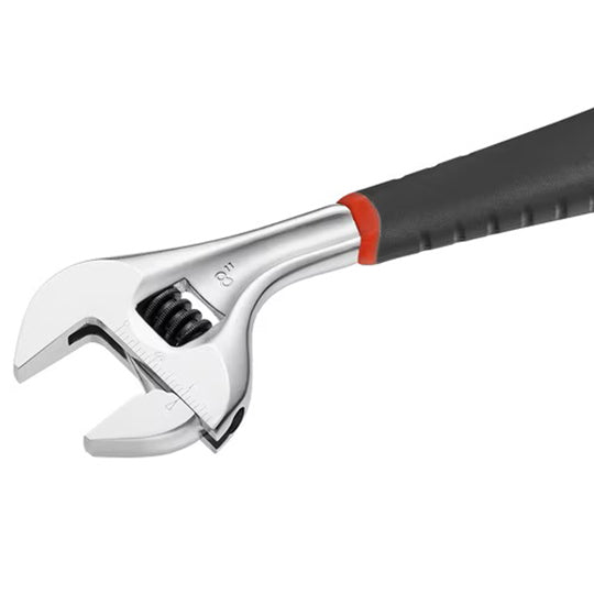 Version G ajustement rapide :||Gain de temps : ajustement facile et rapide du mors mobile sur l'écrou grâce à la molette d'ajustement.||3 étapes :||-tirer la molette : le mors mobile se libère instantanément.||-déplacer le mors mobile à la main pour ajuster à la dimension souhaitée.||-si nécessaire, utiliser la molette de manière traditionnelle pour ajuster très finement.2 à 3 fois plus rapide qu'une clé à molette standard.||Mors à profil fin pour une meilleure accessibilité.||Ouverture extra large permettant une plus grande polyvalence.||Graduation en mm sur une face.||Présentation : corps chromé brillant. Manche bi-matière.