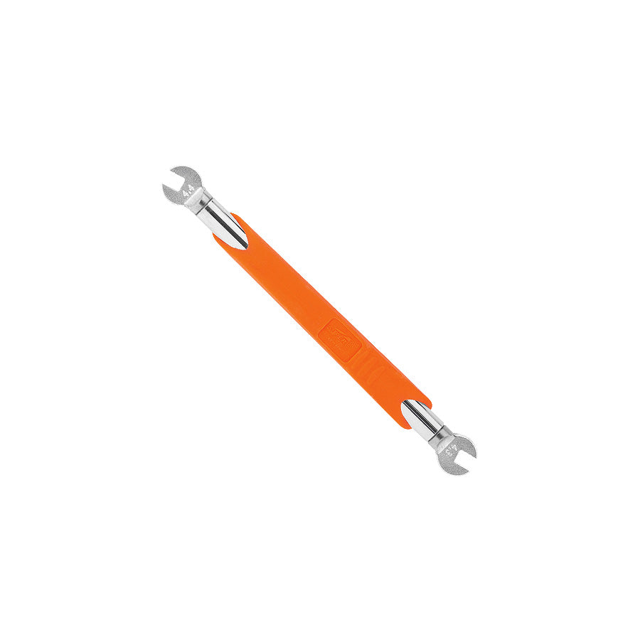 Clé à rayons à double extrémité, traitée thermiquement pour plus de dureté.Poignée confortable en plastique souple.Compatible avec les roues Shimano® ayant des écrous de 4,3 mm et 4,4 mm.