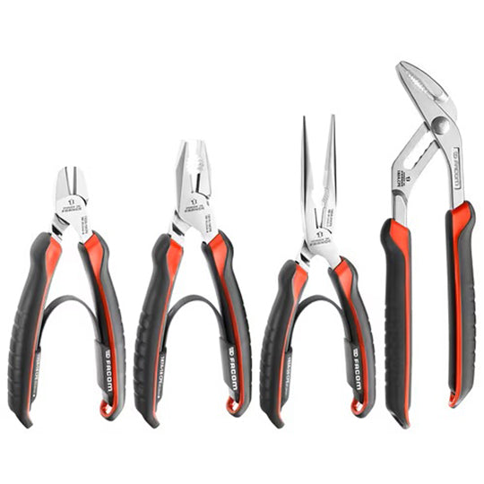 Pince coupante diagonale hautes performances (160 mm) 192A.16CPE.||Pince multiprise hautes performances - 180A.CPE.||Pince à bec demi-rond long - 185A.20CPE.||Pince universelle (180 mm) - 187A.18CPE.||Ergonomie - Poignée plus large offrant un plus grand confort aux utilisateurs qui témoignent dune amélioration de 25 %.||Fabriquée en France dans notre usine de Laissey selon les normes les plus exigeantes par des professionnels aimant leur travail.||Outils professionnels avec garantie de la durée de vie des outils Facom