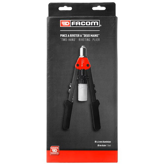 Pince à riveter 2 mains pour usage intensif||Fournie avec 5 embouchures et une clé de serrage : 2,4 mm - 3,2 mm - 4 mm - 4,8 mm - 6,4 mm.||Bol récupérateur de clous intégré